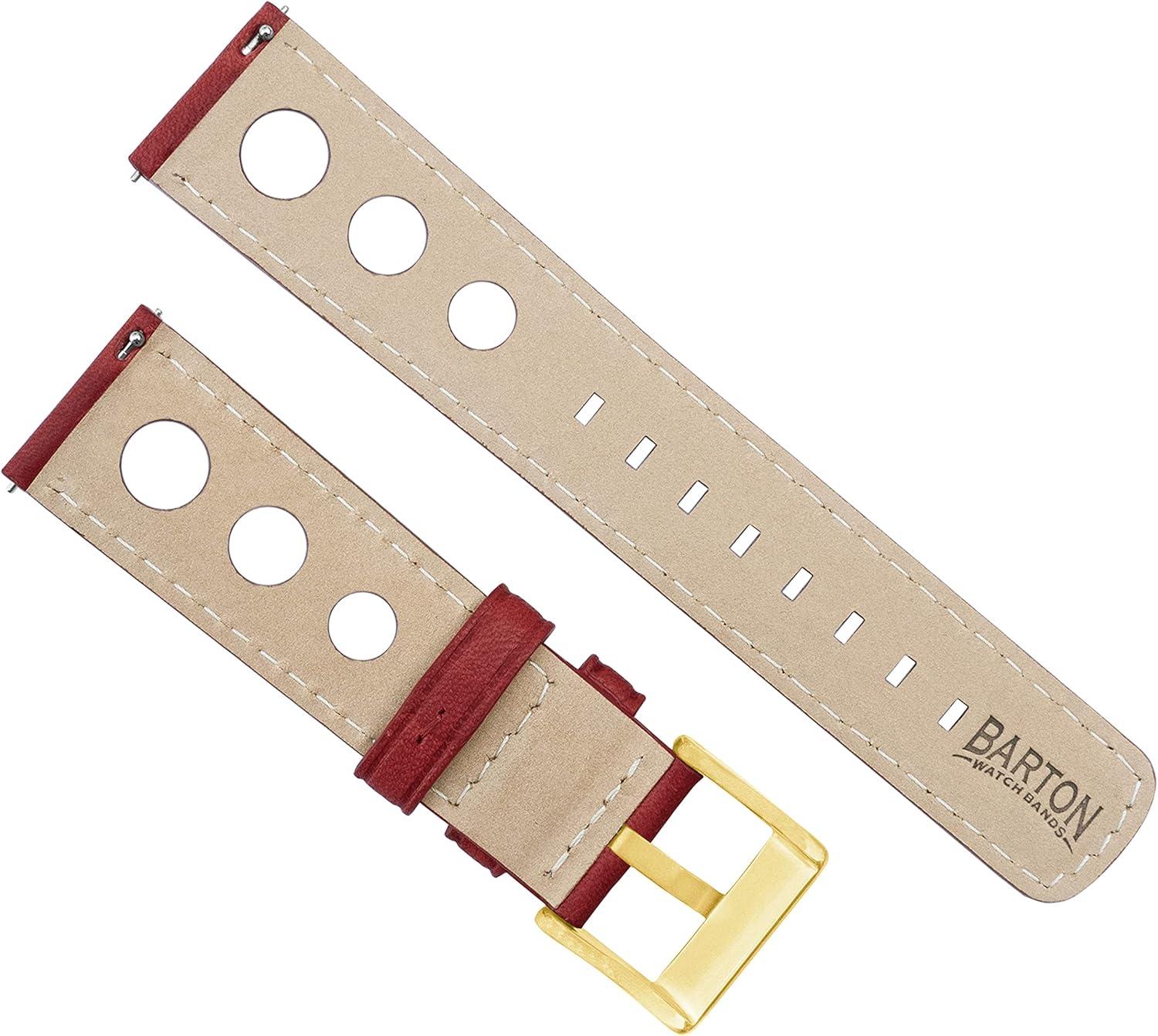 Barton Racing & Rally Horween Leather Straps with Integrated Quick Release Spring Bars - Standard Length fits Wrists 5" to 8"-18mm, 19mm, 20mm, 21mm, 22mm, 23mm & 24mm Watch Bands - Choose Strap Color & Width(Crimson Red (Rally Style) - Gold Buckle)