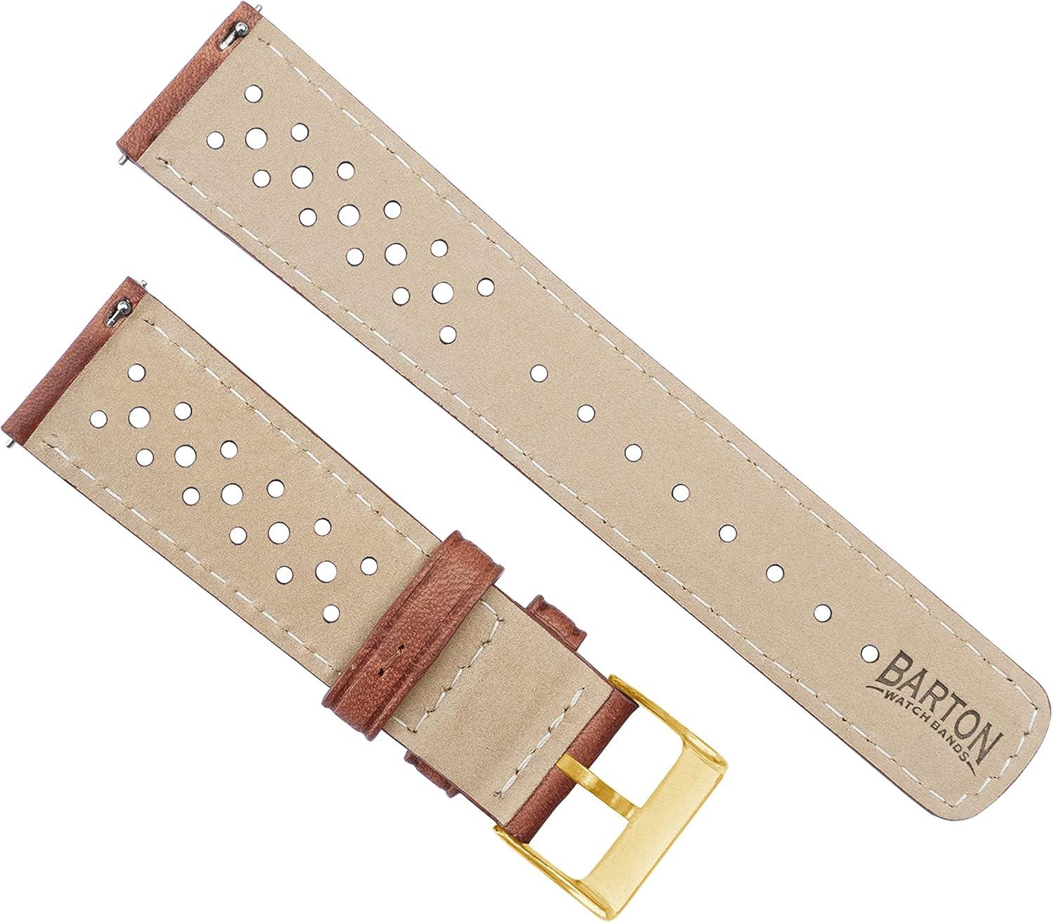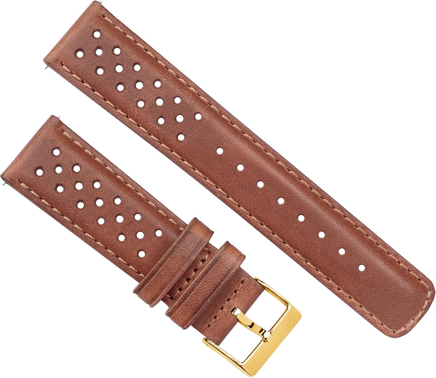 Barton Racing & Rally Horween Leather Straps with Integrated Quick Release Spring Bars - Standard Length fits Wrists 5" to 8"-18mm, 19mm, 20mm, 21mm, 22mm, 23mm & 24mm Watch Bands - Choose Strap Color & Width(Caramel (Racing Style) - Gold Buckle)