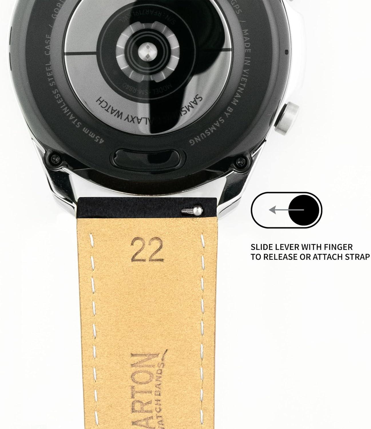 Description This leather quick release watch band is a perfect fit for the Samsung Galaxy Watch4 & Watch4 Classic. This leather watch strap is Crafted from hand selected Italian luxury suede and 316L stainless steel, making it ideal for the workplace or a night on the town. Specifications Swap in Seconds: Integrated quick release spring barsColor: Black Suede & Beige Stitching Material: Italian suede Hardware: 316L stainless steel, Black PVD or Rose Gold Length: Approximately 8-inches. Fits wrists 5 1/2″ to 8″. Lug Width: 20mm Additional Resources All Samsung Galaxy Watch3 Bands