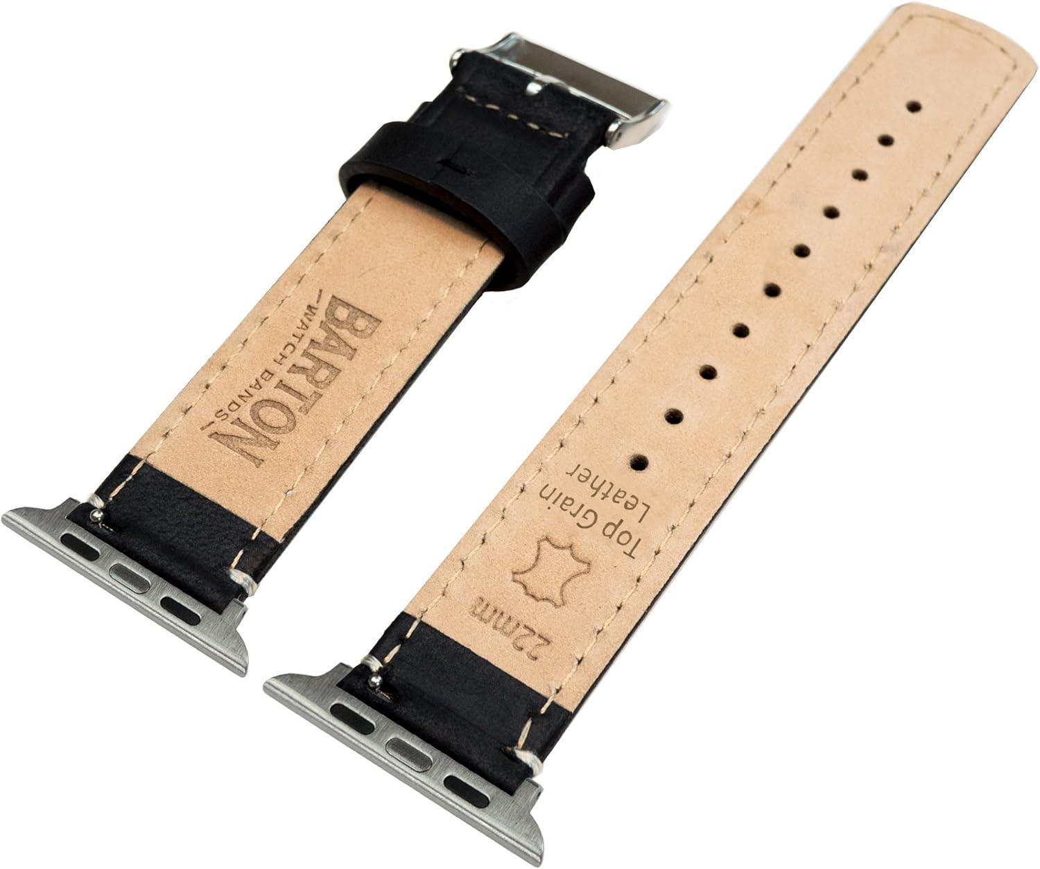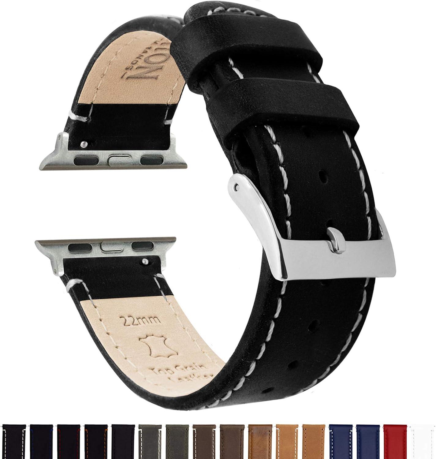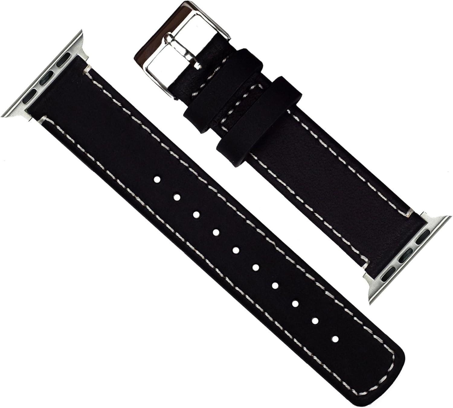 BARTON WATCH BANDS – Top Grain Leather Watch Bands Compatible with Apple Watch Models – 1, 2, 3, 4, 5, 6, 7, 8, 9, 10, SE, Ultra & Ultra 2(Black Leather / White Stitching)