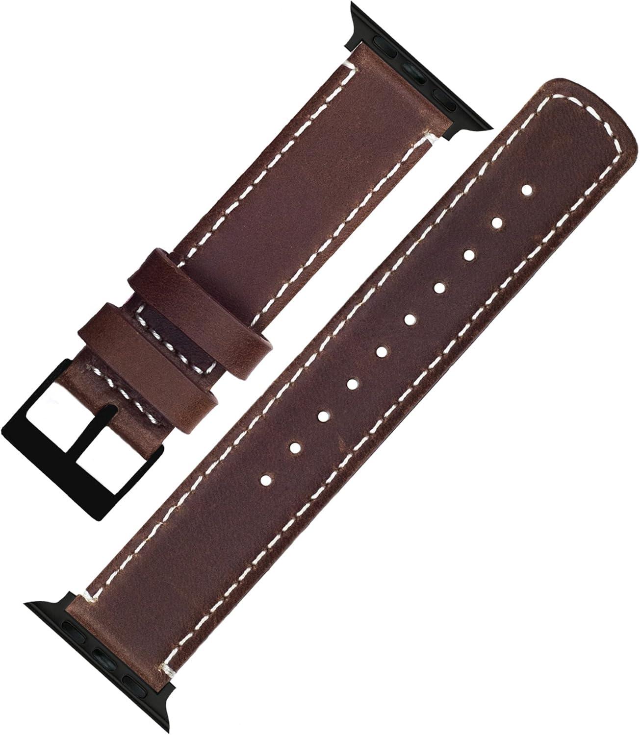 BARTON WATCH BANDS – Top Grain Leather Watch Bands Compatible with Apple Watch Models – 1, 2, 3, 4, 5, 6, 7, 8, 9, 10, SE, Ultra & Ultra 2(Saddle Brown Leather / White Stitching (Black Hardware))